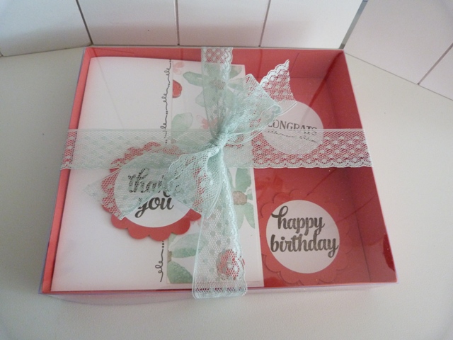 Afgelopen maand maakte ik de bedankkaartjes voor bij de bestellingen. Ik gebruikte de stempelset Garden in Bloom en de set Tin of Cards (pag. 110 van de jaarcatalogus). Maar ik bedacht me dat je de basiskaart ook blanco (zonder tekst) kunt laten en er verschillende labels bij kunt maken. En als je het dan samen in een mooie verpakking doet heb je een SUperleuk cadeau! Zo gezegd zo gedaan en hieronder zie je het resultaat: